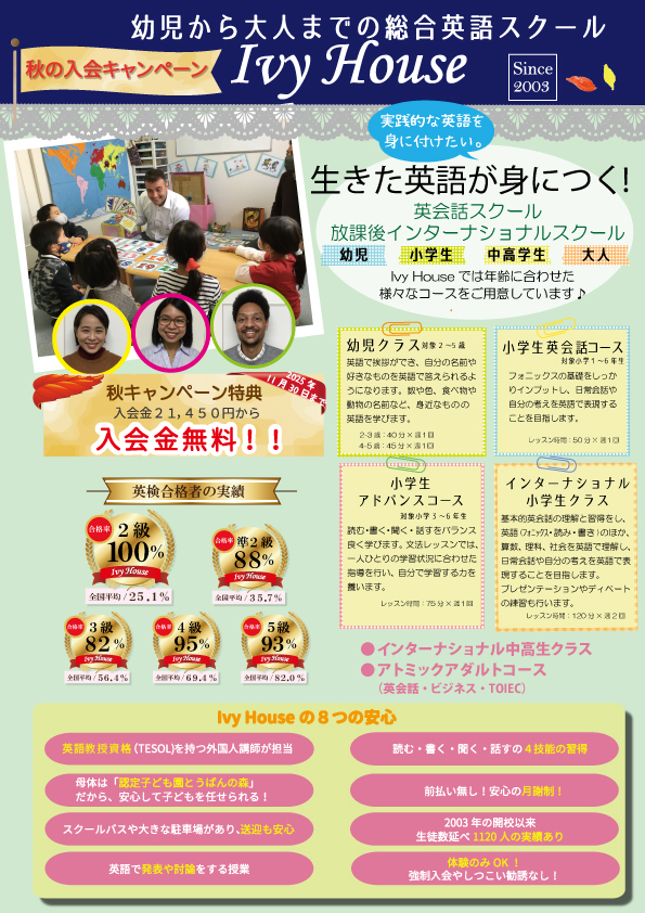 Ivy Houseは『楽しいだけの英会話スクール』ではありません。楽しく学ぶことももちろん大切ですが、英語に多様性が求められる現在、学校英語・受験英語・英語資格なども大切だと考えております。